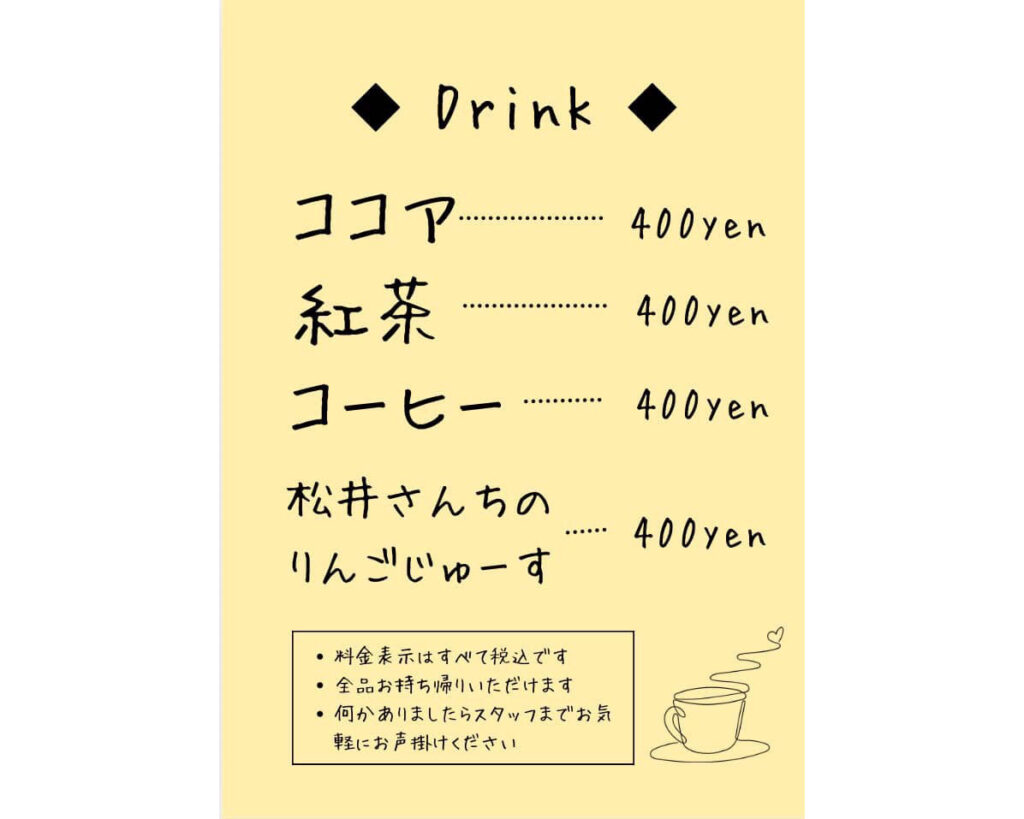・ココア/紅茶/コーヒー/りんごジュース